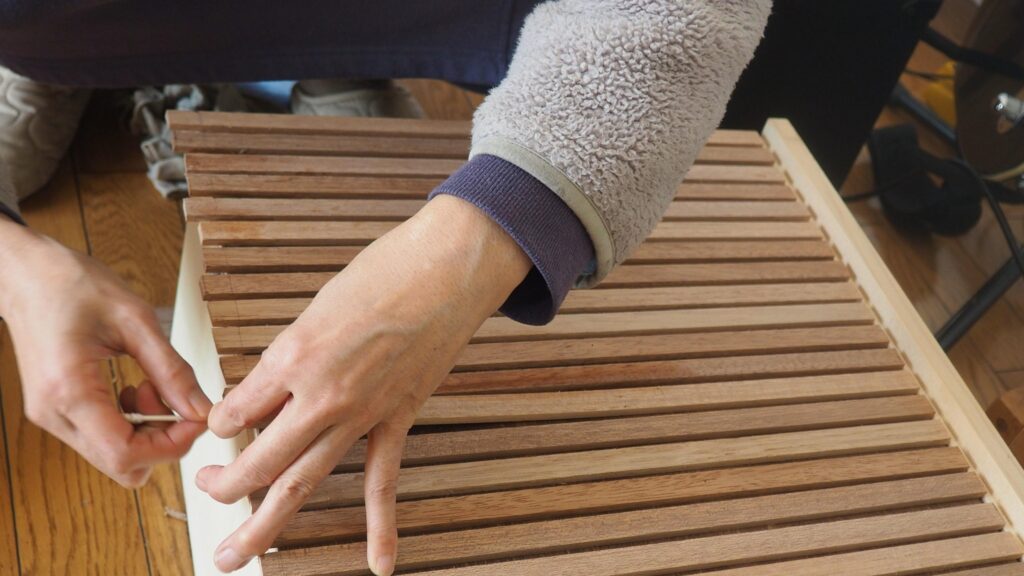 裏面は薄いベニヤ板なので、そのままビスを打つのは少々不安。なので板をかましてからしっかりとビスで止めました。