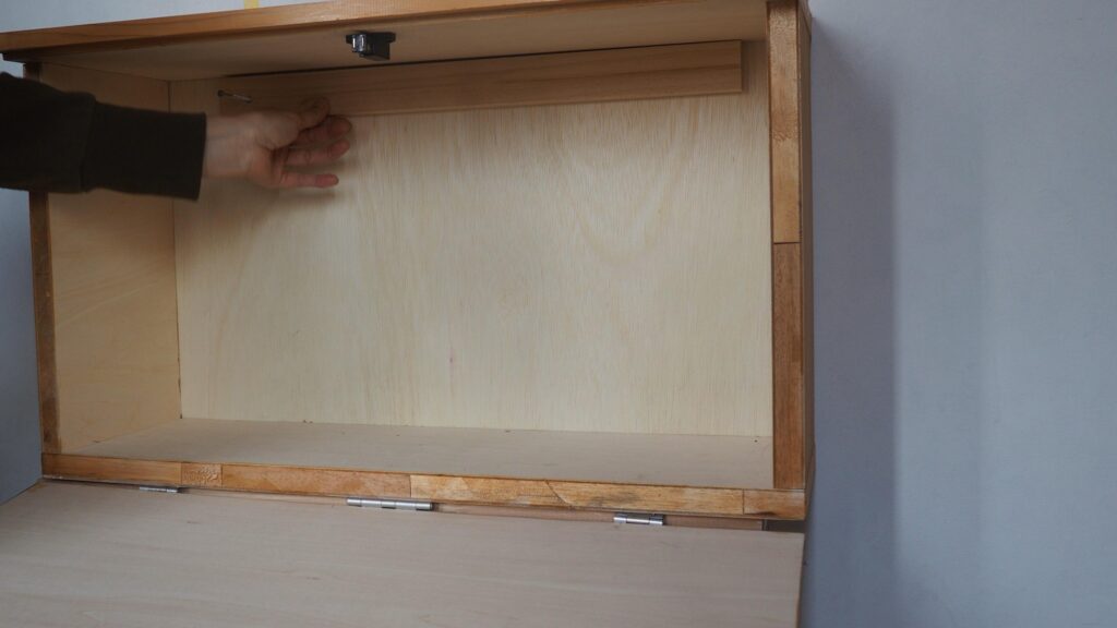 蝶番に負担がかからないようにステーを取り付けます。一気に家具っぽくなりますね!