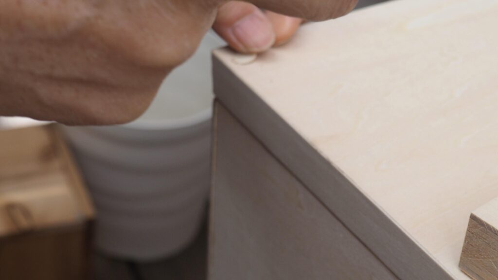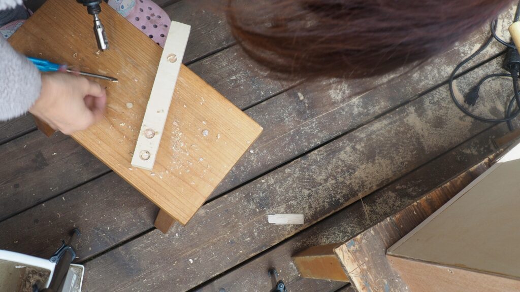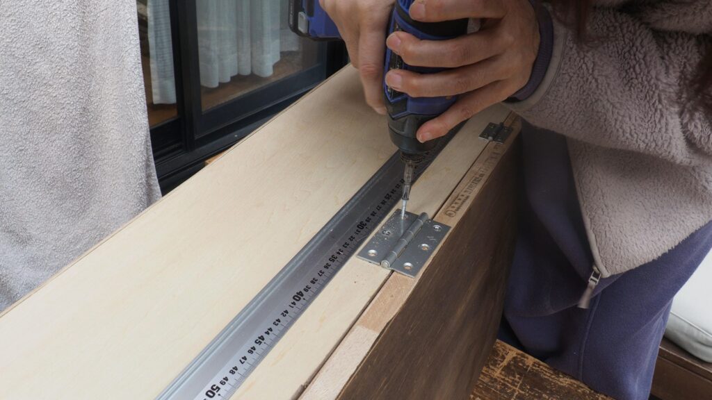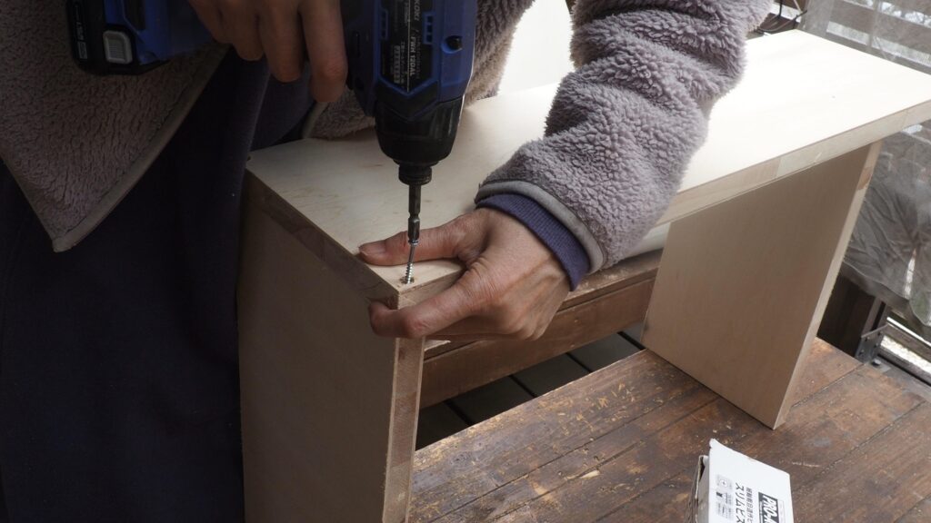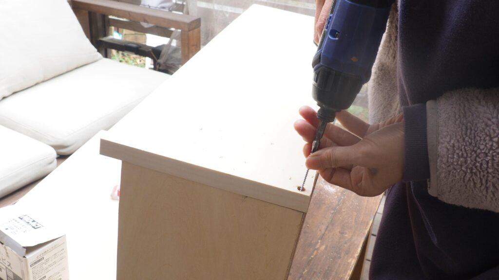 扉が付いたら、上部の板を乗せてビス止めし、四角い箱を作ります。皿取錐で下穴を開けてからビス止め。